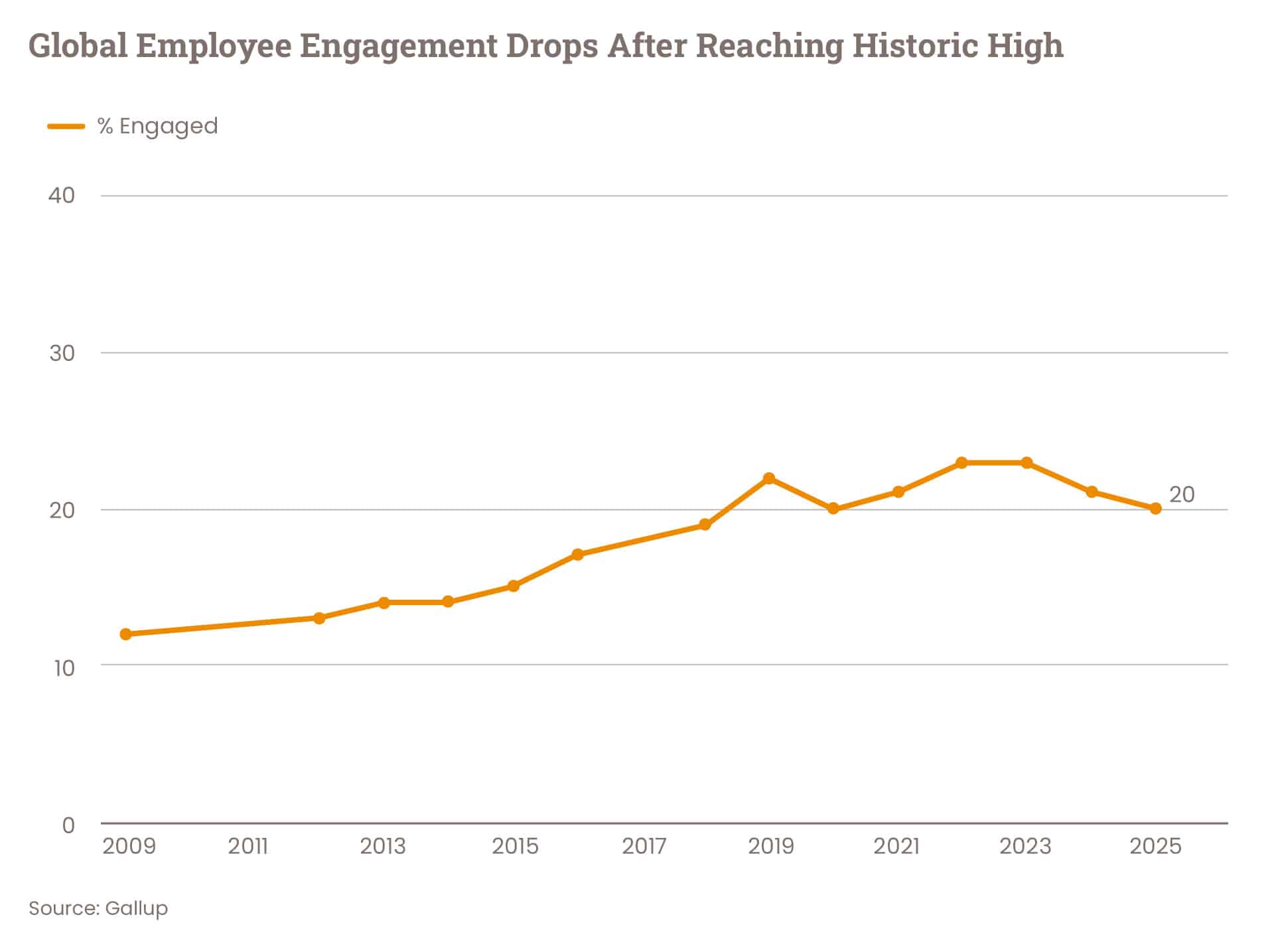 - Employee engagement declined to 20% in 2025, marking a two-year drop that raises concerns for productivity.