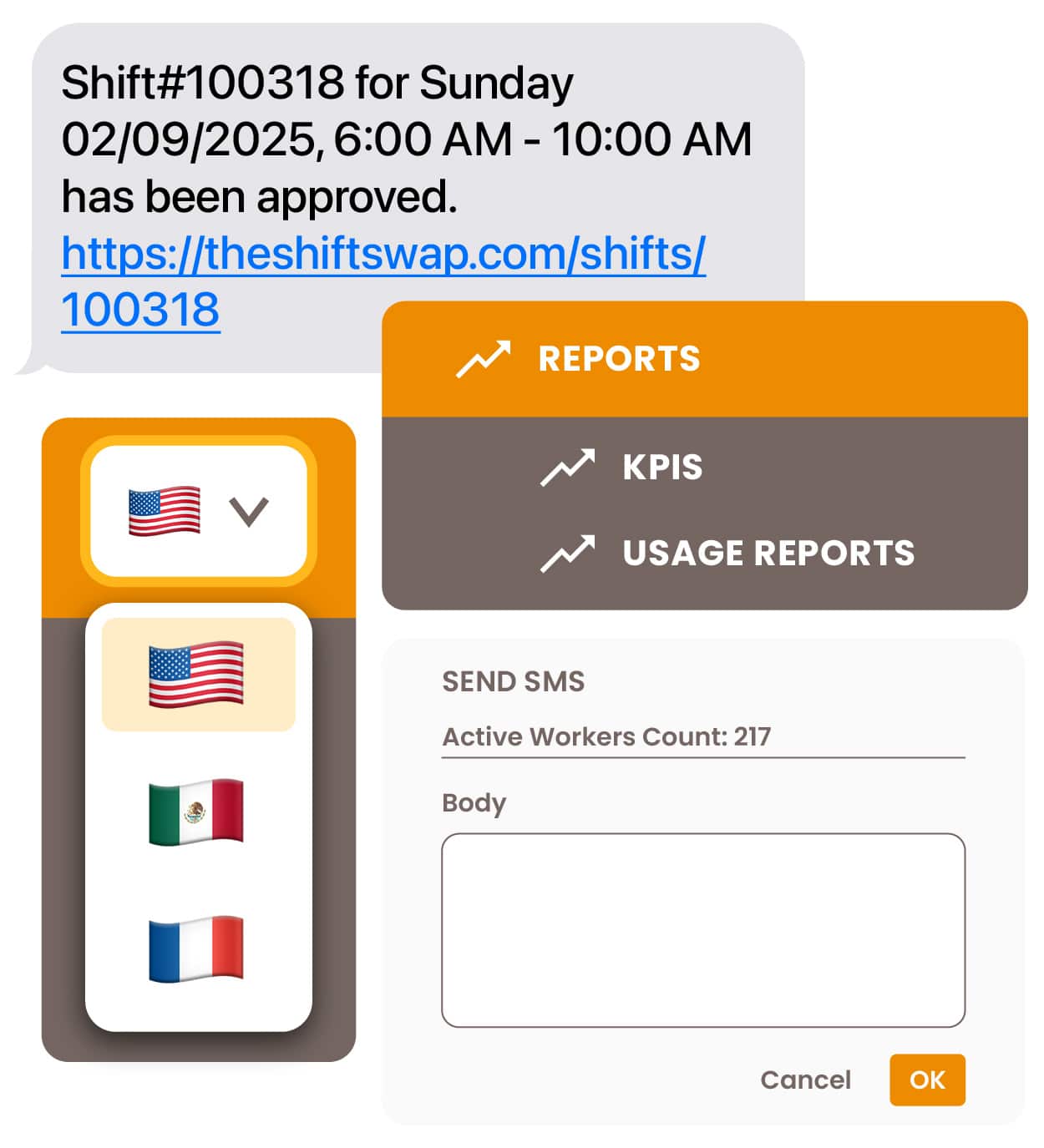 ShiftSwap: Includes unlimited SMS and email alerts for the entire shift coverage process, ensuring leadership and employees stay connected and up to date.